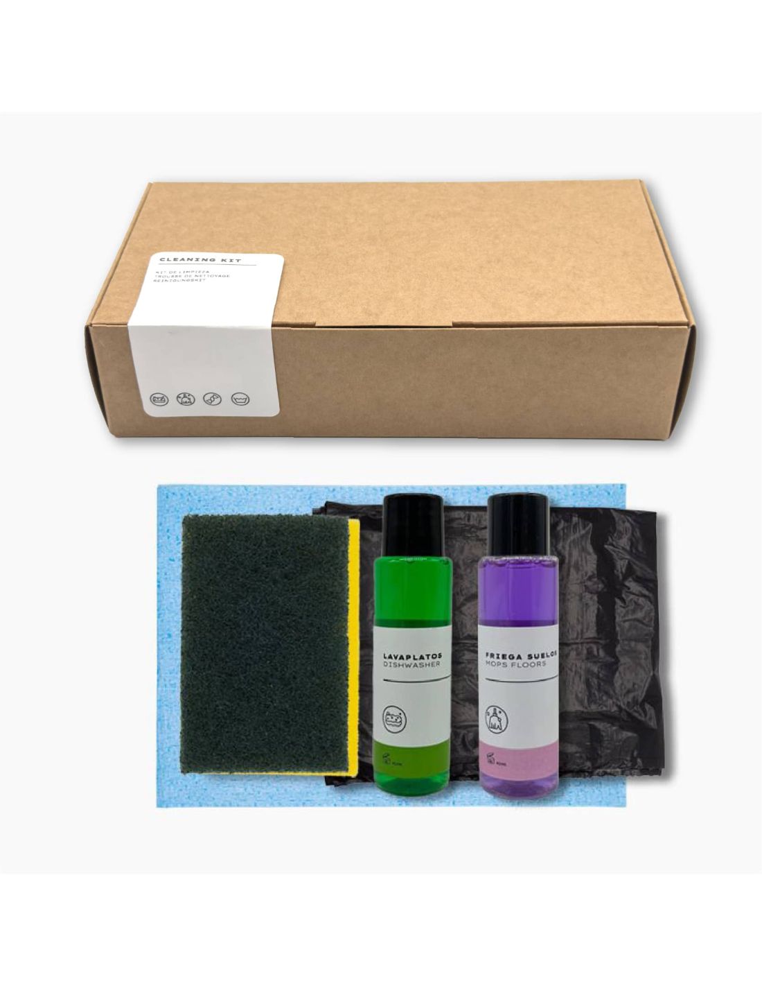 Kit limpieza kraft apartamento y cocina: bayeta, salvauñas, lavavajillas, friegasuelos y bolsa de basura - Amenities Mirahostel