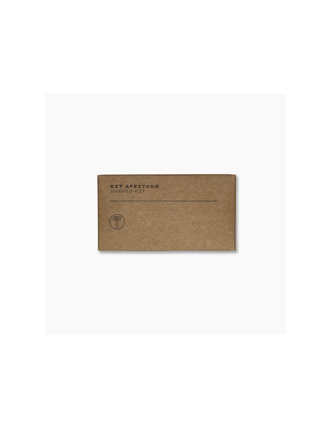 Kit de afeitado formado por un sobre de crema de afeitado y una maquinilla de afeitar desechable. Todo ello se encuentra envasado en una caja de cartón con un diseño actual y muy elegante.