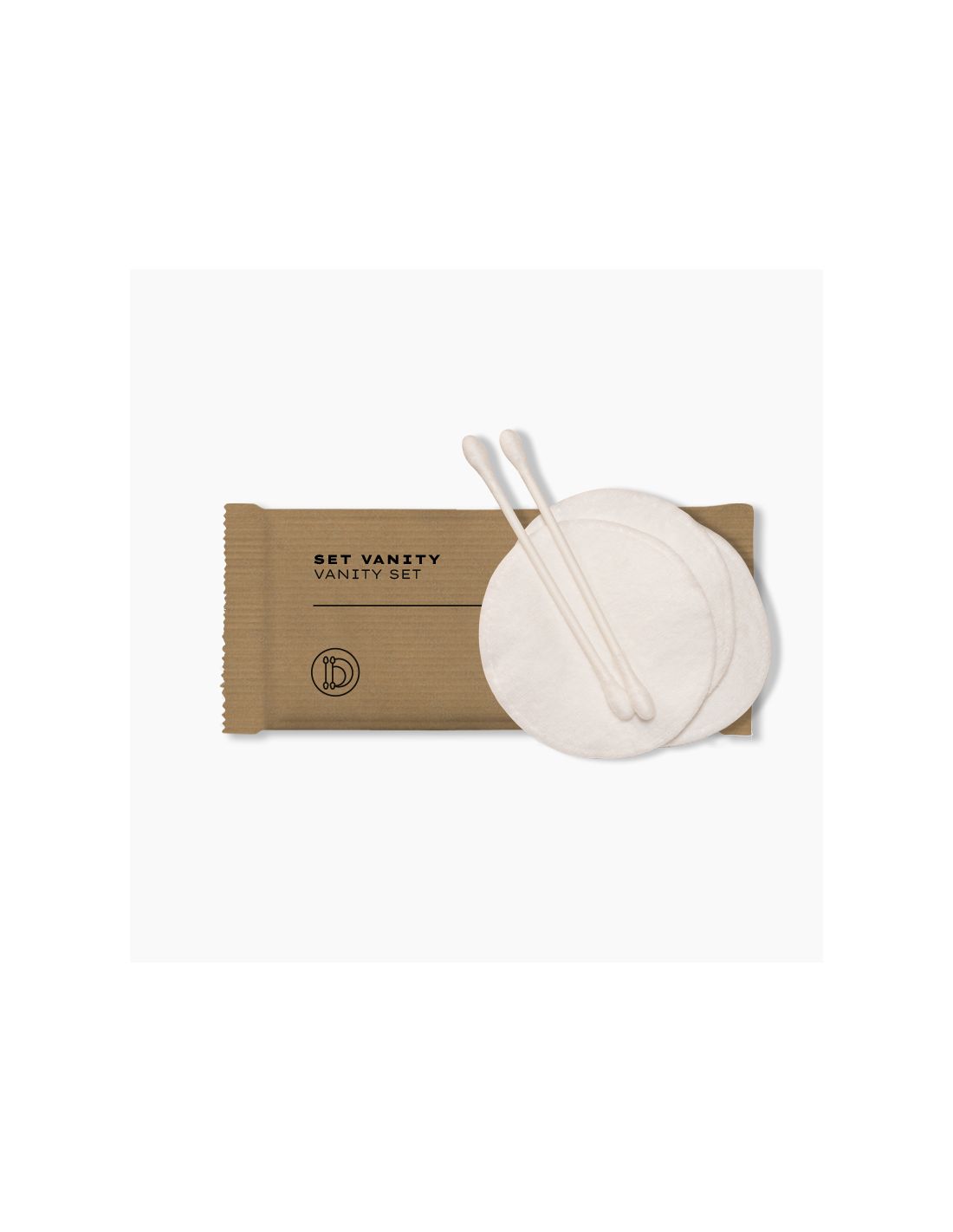 Este Vanity Set pertenece a la gama de los Amenities de Mirahostel y se incluye en un envase de papel reciclado y ecocertificado, pequeño y muy funcional. Los elementos que lo forman son discos desmaquillantes